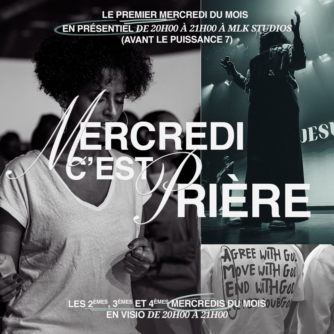 Nous vous proposons un temps de prière avant les émissions Puissance 7 en présentiel le premier mercredi du mois de 20h00 à 21h00 à MLK Studios (2 rue tirard à Créteil) et le deuxième, troisième et quatrième mercredis du mois en visio de 20h00 à 21h00.