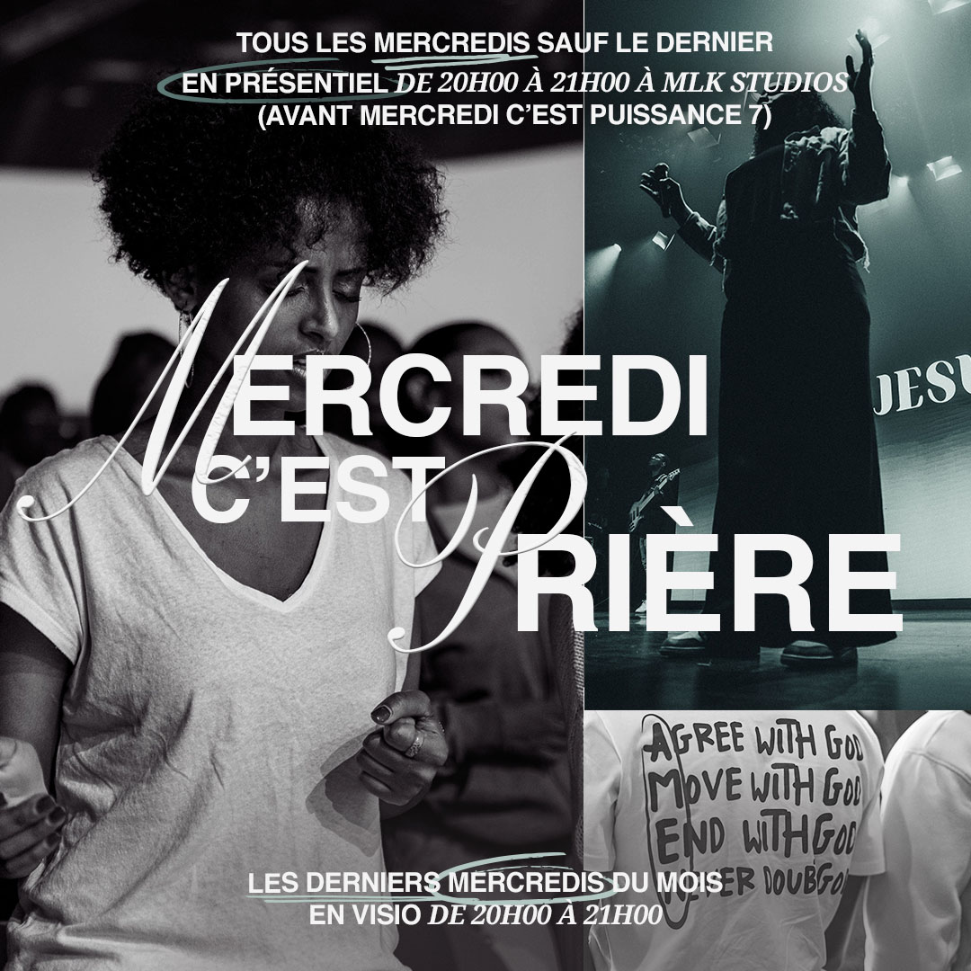 Nous vous proposons un temps de prière avant les émissions Puissance 7 en présentiel le tous les mercredis sauf le dernier de chaque mois de 20h00 à 21h00 à MLK Studios (2 rue tirard à Créteil) et le dernier mercredi du mois en visio de 20h00 à 21h00.